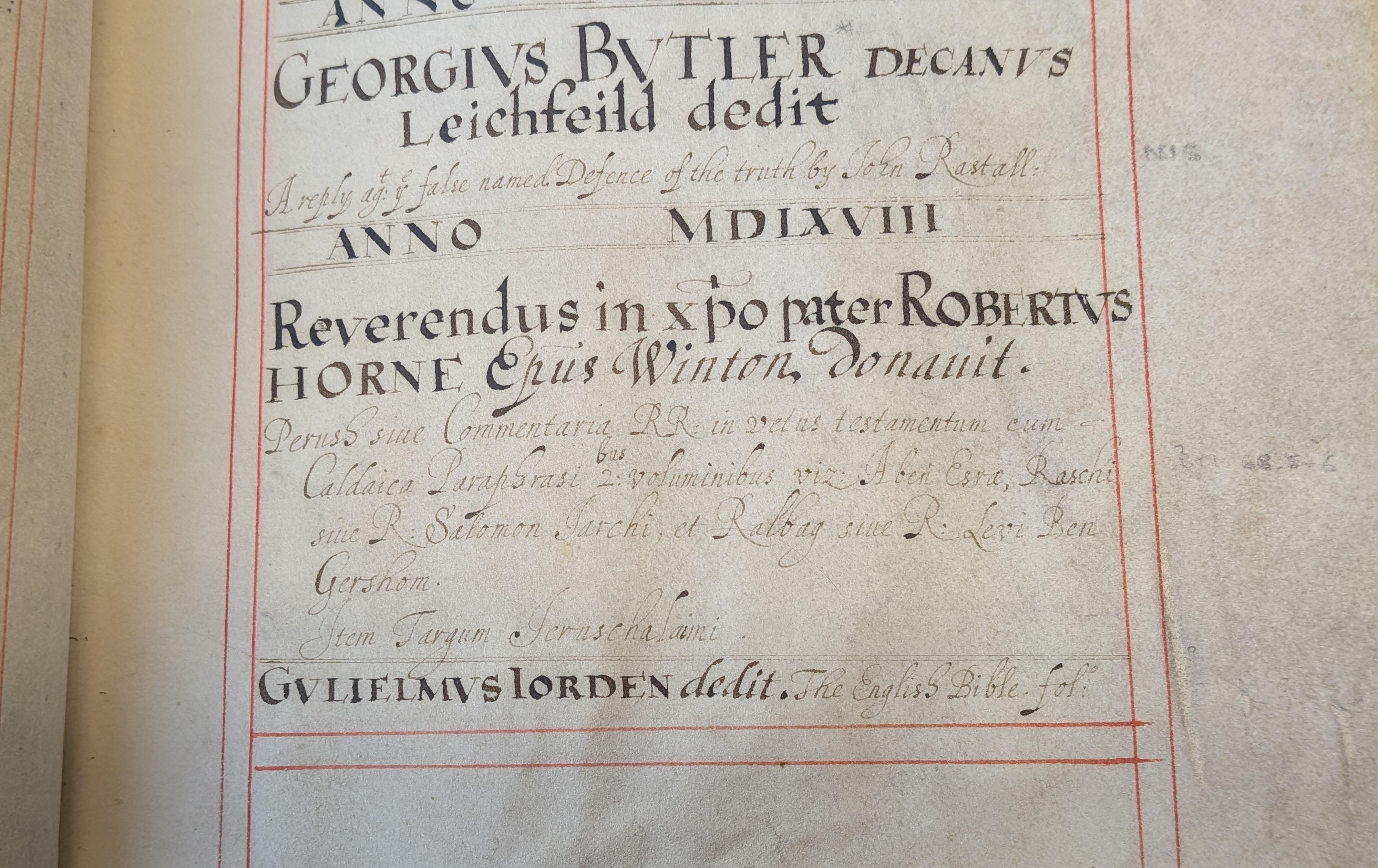 Indeed, over the centuries, New College Library has collected several Hebrew Bibles—here you can see the title-page of one of the oldest and finest (BT1.68.5). Dating from the 16th century, it is a copy of a Bomberg Bible, named after the printer Daniel Bomberg (c. 1483–c. 1549), whose famed workshop was in the city of Venice. This workshop was the first in the world to print Hebrew Bibles, which was an enormous undertaking as a range of new typefaces had to be produced in order to print it.