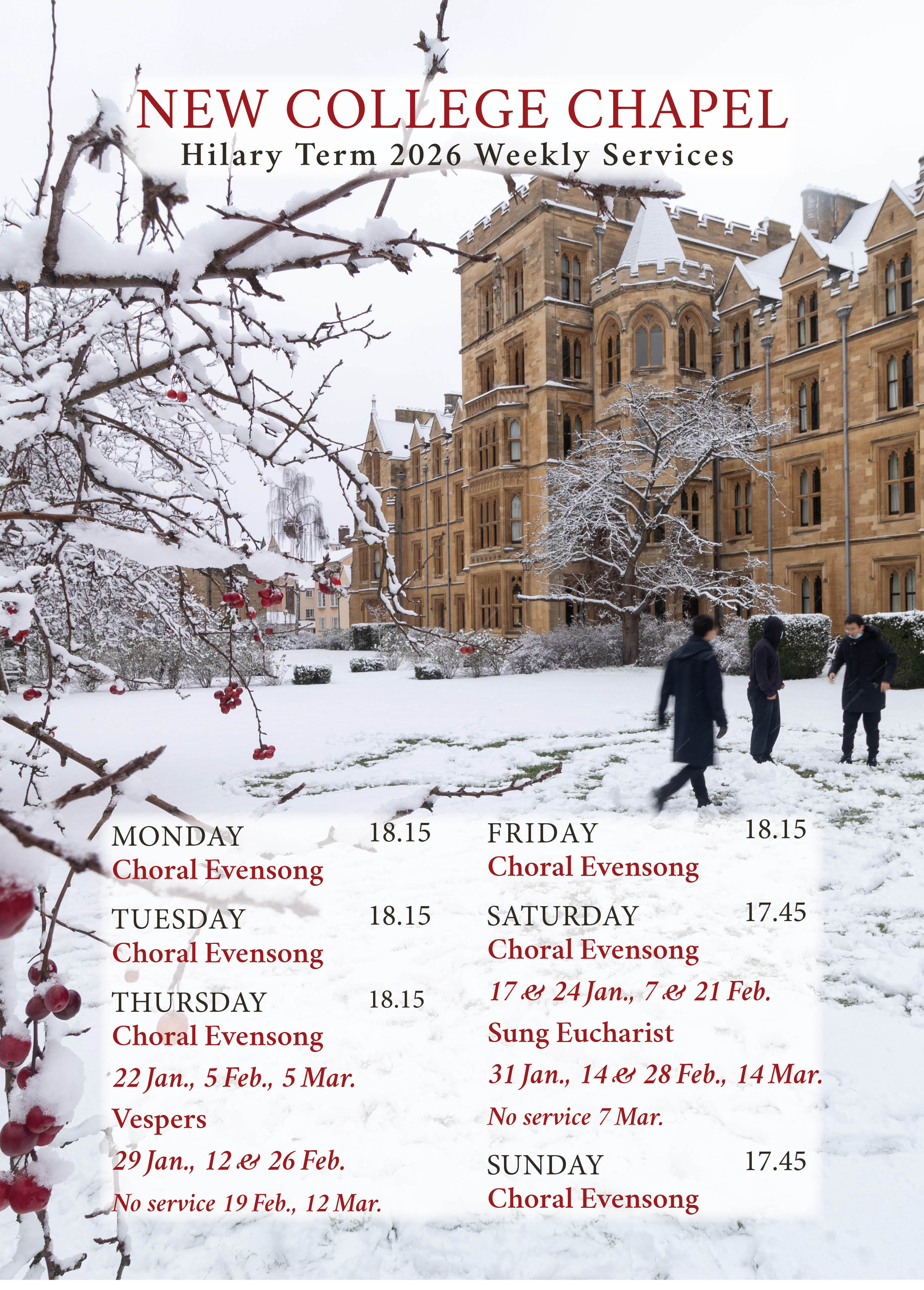 Here is a list of Special Services and Service Times for Hilary Term 2026 (16 January – 15 March).